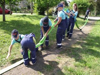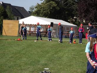 Hierbei müssen die Nachwuchsbrandbekämpfer, nach einem festgelegten Ablauf, Schläuche verlegen und kuppeln, drei Feuerwehrknoten herstellen und Zielen mit der Kübelspritze bekämpfen.