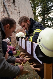 Mit dem Adrenalinschub ging es weiter zur Station 2 „kleiner Löschangriff“ an der Fischtreppe auf der Lindenallee. Hier musste die gesamte Gruppe gemeinschaftlich ein Rohr füllen, um an die Zahlen auf Tischtennisbällen für das Schloss an der Schatzkiste zu kommen. Der Wind erschwerte zwar das Ziel, aber zusammen konnten alle Gruppen mit der Zahlenkombination 112 in die Schatzkiste schauen.