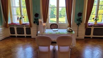 Traumhaft heiraten lässt es sich hier im Rokoko-Saal, in dem bis zu ca. 80 Gäste Platz finden. Das Schloss ist umgeben von einem großen Park, der sicherlich so manches schöne Foto-Motiv bietet. Die Kosten für den Trausaal betragen 400,00 €.