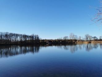 Beim ersten Beobachtungspunkt spiegelte sich der wunderschöne blaue Himmel auf der glatten Wasseroberfläche des Dorfteiches, wo nur sehr entfernt zwei Wasservögel schwammen. Umso mehr war auf dem großen Teich los. Ein schilffreies Stück am Ufer gab den Blick frei auf grob geschätzt hunderte von Vögeln, die lautstark in einem großen Ringelreihen schwammen.