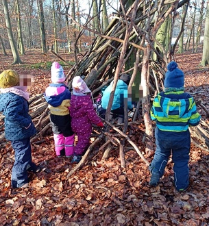 Im Wald warteten dann auch noch viele Äste zum Spielen und Bauen auf uns. Zum Glück stand die Bude vom letzten Jahr noch und alle Kinder konnten in echter Teamarbeit eifrig beim Weiterbau helfen.