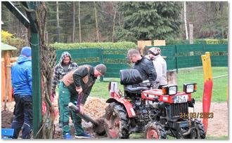 So wurde um das neue Spielgerät im Garten, hauptsächlich für die Krippenkinder, Fallschutz verteilt und ein neuer Sandkasten ausgehoben und für die Befüllung vorbereitet. Zum Beginn des Einsatzes war das Wetter wenig unterstützend, dennoch waren alle Helfer stark motiviert und es wurde in kurzer Zeit viel bewegt und geschaffen.