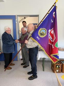 Ehemalige und der jetziger Vereinsvorsitzende vor der neuen Vereinsfahne v.l.: H. Gärtner (1961 – 1967 „Traktor“), D. Krenz (1968 – 1981 „Aufbau“), F. Nowak ( seit 2014 „BSV 90“ ), W. Biehl (1999 – 2014 „BSV 90“ )