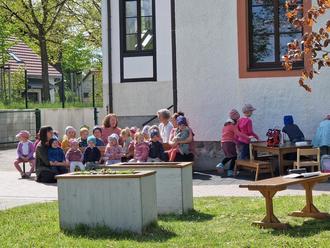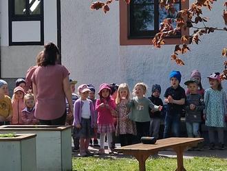 Los ging es mit einem kleinen Programm, welches den Gästen einen kurzen Einblick in den Kindergartenalltag bot. Unsere Jüngsten der Gruppen 1, 2 und 3 bildeten einen „Morgenkreis“ und sangen Lieder, mit denen wir täglich in den Vormittag starten. Die Gruppen 4 und 5 gestalteten eine Frühstücks- und Spielsituation nach.