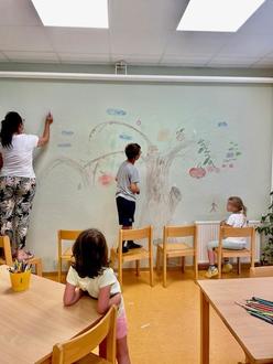 Mit einem Topf bunten Stiften werkeln die Kinder aktuell an dem Wandgemälde im Hortbereich.