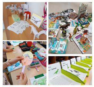 In der kurzen Woche vor Himmelfahrt entführten wir unsere Schülerinnen und Schüler in die aufregende Welt der Dinosaurier. Am Montag startete jede Klasse für sich mit ganz unterschiedlichen Ideen und Stationen, um in das urzeitliche Geschehen einzutauchen. Liebevoll und sehr kreativ hatten die Klassenlehrer Dino-Rätsel, Dino-Puzzle oder eine knifflige Bastelarbeit vorbereitet. Dadurch wurden alle Kinder wunderbar in das Thema Dinosaurier eingeführt.