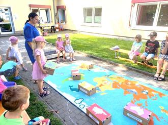 Die Kinder freuten sich sehr, die einzelnen Kontinente auf den großen Teppich mit der Weltkarte zu stellen. Dabei entdeckten sie, dass die Pinguine da leben, wo es kalt ist.