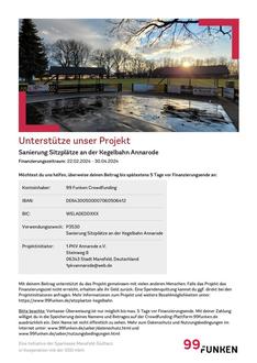 Mit deinem Beitrag unterstützt du das Projekt gemeinsam mit vielen anderen Menschen. Falls das Projekt das Finanzierungsziel nicht erreicht, erhalten alle ihr Geld zurück. Eine Spendenquittung kannst du ggf. direkt bei den Projektinitiatoren anfragen. Mehr Informationen zum Projekt und weitere Bezahlmöglichkeiten unter: http://www.99funken.de/sitzplaetze-kegelbahn