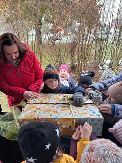 Oben auf dem Berg hat er viele Kartons geschleppt, in einem Buch gelesen, ist eifrig hin und her gelaufen. Und wir haben ihn von weitem beobachtet. Aber als wir dann Weihnachtslieder gesungen haben, hat er uns mitbekommen und hat uns gewunken und getanzt. Auf den Weg zurück zur Kita fanden wir unter dem geschmückten Baum an der Gaststätte Warnt für jeden von uns ein Geschenk.