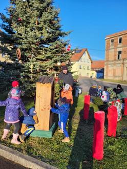 Es ist schon zur Tradition geworden, dass die Kinder vom Kindergarten " „Heideglück“ in Weickelsdorf den „Heimatfreunden“ beim Schmücken des Tannenbaums am Dreieck helfen. Sie waren mit ihrem Erzieher Herrn Heuber gekommen, um Selbstgebasteltes am Tannenbaum aufzuhängen. Rita und Herbert Ignor sowie Ute und Detlef Bagehorn begrüßten die Kinder und schon war ein Gewimmel um den Baum, jeder wollte etwas aufhängen. Herr Heuber nahm die Kinder hoch, um ihnen die Möglichkeit zu geben, weit oben ihren Baumschmuck aufzuhängen. Zum Abschluss wurde gemeinsam ein Lied gesungen und den Kindern Plätzchen und Süßigkeiten übergeben. Eine Geldspende von den " Heimatfreunden soll für Bastelmaterial im Kindergarten verwendet werden. Ein großes Dankeschön an die Kinder und deren Erzieherinnen und Erzieher. Birgit Berthold, Initiatorin des Dreieck Roda meinte, " Nichts aufschieben ist meine Devise!"