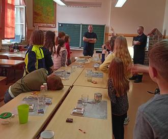 Rund ums Thema Feuer ging es an der Station „Experimente“. Wie entsteht überhaupt ein Feuer? Brennt eine Kerze weiter, wenn ich ein Glas darüber setze? Dieses und weitere kleine „Experimente“ konnten die Schüler hier ausprobieren.