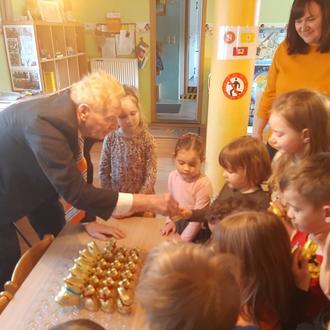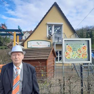 Artur Krumbholz, Mertendorf, fühlt sich über viele Jahre mit dem Punkewitzer Kindergarten eng verbunden, denn dort war er 1938 einer der ersten Kinder. Am 2. April 2024 überreichte er den Kindern eine großzügige Osterhasen-Spende. Die Kinder waren begeistert und sangen ihm zu Ehren schöne Kinderlieder.