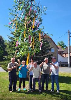 Am Tag vor dem 1. Mai trafen sich die Heimatfreunde vom Dreieck Roda in einem deutlich kleinen Kreis, um traditionsgemäß einen Maibaum zu setzen. Wegen des längeren Wochenendes waren einige Mitglieder mit ihren Familien unterwegs und konnten dem "Spektakel" nicht beiwohnen. Rita Ignor hatte dafür die bunten Schleifen extra nochmal sorgfältig gebügelt bevor sie am Maibaum aufgehängt wurden. Nach getaner Arbeit ließ man sich unter der nebenstehenden Linde nieder, um Geburtstage der Mitglieder nachzufeiern. Eltern sowie Großeltern, die ihre Kinder vom Schulbus abholten, wurden in die Feierlichkeiten einbezogen.