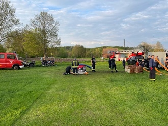 Hier wird am Samstag ab 09.00 Uhr der Kreisausscheid „Löschangriff Nass“ stattfinden, zu dem sich auch einige Mannschaften aus dem Wethautal gemeldet haben. Grund genug, dass sich die Wehren aus Utenbach, Meineweh und Stößen spontan am Freitag, dem 12.05.2023, in Cauerwitz zum gemeinsamen Üben trafen.