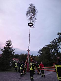 An der Feuerwehr gab Bürgermeister a.D. Müller nochmals den weiteren Ablauf bekannt und unter der Leitung von Setzmeister Karsten Riehm wurde der wunderschöne Maibaum von der Feuerwehr Meineweh in die Senkrechte gestemmt.