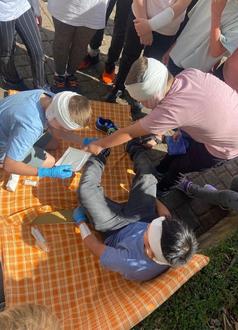 Alle Kinder nahmen an einem Erste-Hilfe-Kurs unter Leitung von Roman Ehrig vom DRK teil und lernten, dass schon das Hilfe holen zum Helfen gehört. Sie versorgten kleine und große Wunden und mussten ihr Wissen auch in einem "realen" Fall anwenden. Dabei lernten die Mädchen und Jungen, dass es sehr wichtig ist, einen Sichtschutz um den Verletzten zu stellen, damit in Ruhe geholfen werden kann.