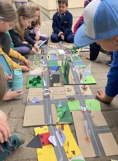 Die Lehrerinnen hatten sich viele weitere Stationen rund um die Verkehrserziehung ausgedacht. So wurden Straßenzüge gebaut und zu einer Stadt zusammengelegt oder es ging sportlich zu beim Rollen, Gleiten und Fahren in der Turnhalle.