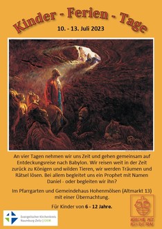 An vier Tagen im Juli nehmen wir uns Zeit und gehen gemeinsam auf Entdeckungsreise nach Babylon. Wir reisen weit in der Zeit zurück zu Königen und wilden Tieren, wir werden Träume und Rätsel lösen. Bei allem begleitet uns ein Prophet mit Namen Daniel - oder begleiten wir ihn?