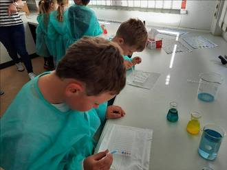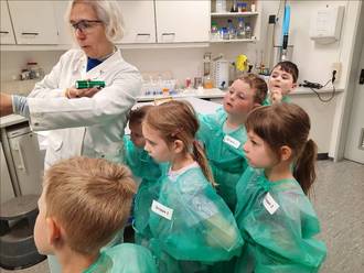 Am 13. Mai 2025 waren wir zu Gast bei Analytik Jena. Wir wurden eingeladen, um dort Experimente mitzumachen. Mit dem Bus starteten wir gegen viertel neun in Richtung Jena, die Fahrt dauerte etwa eine Stunde und dort wurden wir von Frau Barth in Empfang genommen. In der Firma angekommen, wurden wir herzlich begrüßt und jeder bekam erst einmal einen Laborkittel angezogen. Die Kinder wurden in zwei Gruppen aufgeteilt und diese sollten 5 Stationen durchlaufen. Natürlich waren alle sehr aufgeregt was auf sie zukommen wird. An einer Station erfuhren wir wie ein Vulkan funktioniert und halfen mit bei dem Experiment, an der zweiten Station machten alle riesige Seifenblasen. An der dritten Station erfuhren wir ganz viel über das Licht und warum man manchmal Regenbogen bestaunen kann und noch einiges mehr. Das war alles sehr aufregend und manchmal konnten wir schon Fragen beantworten. Den Umgang mit der Pipette übten wir als Nächstes, träufelten verschieden farbige Flüssigkeiten in kleine Behältnisse. Man konnte sogar Muster machen und am Ende wurden diese zugeschweist und jeder nahm seins mit nach Hause.