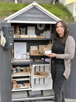 Es ist schon ungewöhnlich, unmittelbar vor einem Wohnhaus einen Laden stehen zu sehen. Zwar zeigt das Bild auch die Besitzerin, doch nur beim befüllen mit all den reichlichen Angeboten an Geschenken oder auch Mitbringsel, die man hier aussuchen und erwerben kann. Man kann auch Geschenke bei ihr bestellen und so seinem Wunschprodukt näherkommen. Jedes Stück wird mit Sorgfalt und Herz gefertigt, versichert sie.