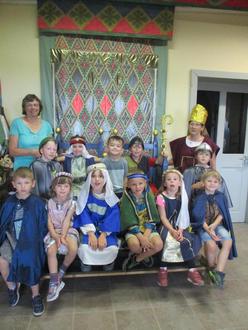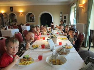 Am Freitag, dem 23.06.2023, stand unsere traditionelle Abschlussfahrt auf dem Programm. Gleich nach dem Frühstück starteten wir, mit Höhne Touristik, in Richtung Freyburg. Unser Ziel war die Kinderkemenate auf der Neuenburg. Dort gingen wir auf eine Zeitreise vor über 900 Jahren. Wir erlebten hautnah das höfische Leben. Verkleideten und als Graf Ludwig oder seine Gemahlin Adelheid, durften auf einem Thron sitzen oder uns in die vornehmen Gäste des hohen Paares verwandeln wie zum Beispiel: in eine Königin, Prinzessinnen, Ritter, Knappen, Torwachen oder Bischof. Gemeinsam feierten wir ein Fest und besuchten sogar das Schlossgespenst im Wohnturm. Danach hieß es: auf zur Zuckertütensuche im Schlosshof. Es dauerte gar nicht lange und unsere Großen wurden fündig. Für jeden Schulanfänger hing eine Zuckertüte am großen Lindenbaum. Stolz nahm jeder seine persönliche Tüte in Empfang. Für alle anderen gab es auch eine kleine, süße Überraschung. Nach so viel Aufregung knurrte allen langsam der Magen. Unser Ausflug ging nun weiter nach Naumburg, zum Halleschen Anger. Dort ließen wir uns, an einer festlich geschmückten Tafel, unser Mittagessen (Pommes und Nuggets) lecker schmecken.
