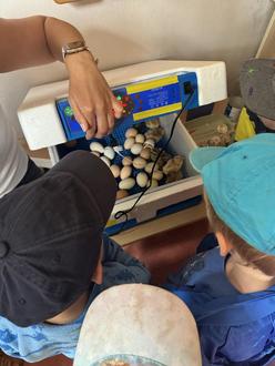 Zuerst haben alle Kinder unserer Kita gemeinsam die 30 befruchteten Eier vorsichtig in den Brutkasten gelegt. Dieser wurde dann auf 37 Grad Temperatur gebracht und alle Kinder waren gespannt und voller Euphorie die Eier zu beobachten.