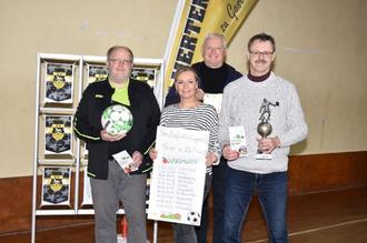 Von links; Ulrich Baumann, Mitglied des Vorstandes SV Mertendorf e. V., Prokurist Volks- und Raiffeisenbank Saale Unstrut eG, Anne Loeper, 1. stellv. Vors. MNfG e. V. und Koordinatorin Apfel-Latein, Dipl.-Sozialmanagerin, Michael Schwarze, Vors. MNfG e. V. und Mitbegründer der Benefizfußballspiele, Pressereferent bei der AOK Sachsen-Anhalt, Albrecht Günther, Mitbegründer der Benefizfußballspiele, Redaktionsleiter MZ Nebra/Naumburger Tageblatt