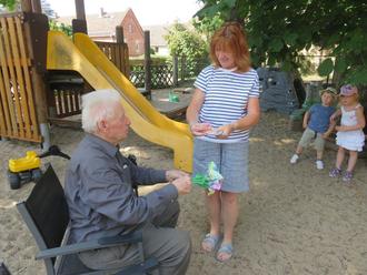Artur Krumbholz fühlt sich mit dem Punkewitzer Kindergarten eng verbunden, denn dort war er 1938 einer der ersten Kinder. Am 17. Juli 2023 überreichte er den Kindern wieder eine großzügige Spende.