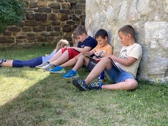 Da das Wetter sonnig war, beschlossen wir, unsere Leseplätze auf dem Schulhof zu suchen. So vergingen 45 Minuten wie im Flug und die Kinder tauchten in viele verschiedene Welten ein. Manche lasen gemeinsam, manche lasen allein. Die Kinder saßen auf der Mauer, lagen im Gras und hockten im Schneidersitz am „Matzturm“.