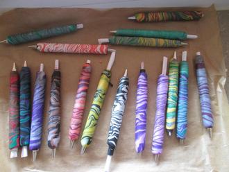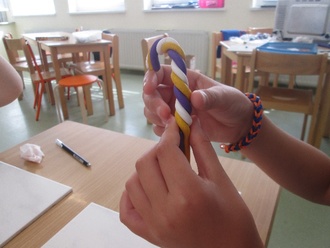 Wir haben Knete abwechselnd in der Hand geknetet und auf einer Fliese mit dem Daumen draufgedrückt. Dann haben wir es zu einer Kuller gerollt und Schlangen daraus gemacht. Danach haben wir sie zusammengehalten und immer drum herum gerollt wie eine Zuckerstange. Als die Kulis mit der Knete umwickelt waren, kamen sie in den Ofen. Ich fand es toll, dass wir uns bunte Kulis machen konnten und die behalten durften. Außerdem waren wir draußen und haben Eis gegessen.
