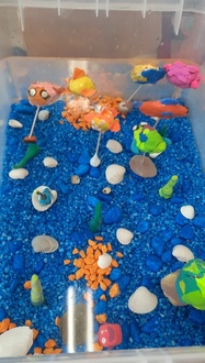 Am Mittwoch durften dann alle Kinder im Pool planschen. Ein sehr schönes Aquarium mit tollen bunten Fischen aus Knete und Styropor entstand dann am Donnerstag. Wir waren sehr gespannt, welcher Fisch ohne Hilfe im Becken schwimmen konnte.