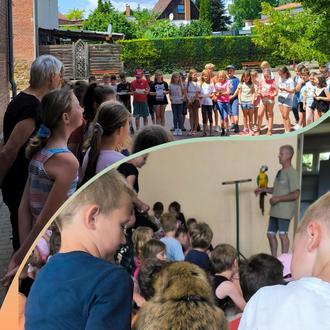 Am 25.06.2025 feierten wir gemeinsam unser diesjähriges Abschlussfest, welches uns noch lange in Erinnerung bleiben wird. An diesem Tag verwandelte sich unsere Turnhalle in eine farbenfrohe und spannende Erlebniswelt. Mit großen Augen staunten unsere Kinder über den Papagei Pietro und den zwei zutraulichen Affen, die bereits auf uns warteten. Von den Besitzern erfuhren wir viel Spannendes über deren Lebensräume und Gewohnheiten. Darüber hinaus konnten die Tiere auf den Arm genommen, gestreichelt und gefüttert werden. Viel Spaß und Freude kam bei den verschiedenen Geschicklichkeitsspielen und kleinen Mutproben mit dem Papagei auf. Neben all der Freude lag auch ein Hauch Wehmut in der Luft. Wir verabschiedeten nicht nur unsere 4. Klasse, welcher wir auf diesem Weg einen guten Start an der neuen Schule wünschen, sondern auch unsere liebe Kollegin Frau Soisson.. Sie verlässt uns nach vielen Jahren engagierter, herzlicher und inspirierender Arbeit in den wohlverdienten Ruhestand. Mit bewegenden Liedern und Geschenken blickten wir auf die schönsten Momente unserer Zusammenarbeit mit feuchten Augen zurück. Alles Gute und bleib vor allem gesund. Jetzt freuen sich die Kinder und Erzieher aus dem Hort Stößen auf die bevorstehenden Sommerferien mit vielen tollen Erlebnissen.