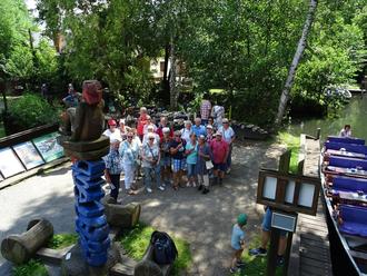 Die für die Region bekannte Kahnfahrt in den Spreegewässern bot mehr als den gewohnten Seniorennachmittag. Häuser, bedeckt mit Reed Dächern, offene Hauseingangstüren und freundliche Hauseigentümer boten für den Spreewald typische Waren an. Gurkenhäppchen, Schmalzbrot und auch ein Becher Kaffee stand zur Auswahl. Doch man war durch das Mittagessen gesättigt. Das LEHDE Museum war der erste Haltepunkt und alle mussten den Kahn verlassen, was für uns „Alte“ nicht einfach war. Ein Gruppenbild musste sein.