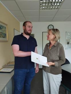 Die Verbandsgemeindebürgermeisterin, Frau Kerstin Beckmann, gratuliert Herrn Burchardt zur erfolgreich bestandenen Abschlussprüfung.