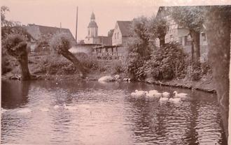 Ein typischer Dorfanblick mit Dorfteich (Rittergutsteich), Enten, Gänsen und Baumbewuchs. Die Kirche war der Dorfmittelpunkt.