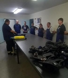 Am 20.07. stand für die Jugendfeuerwehr ein Dienst der etwas anderen Art auf dem Plan. Zusammen mit 3 Betreuern machten wir uns auf den Weg nach Naumburg zur Feuerwehrtechnischen Zentrale, kurz FTZ. Dort wurde uns als erstes der Aufbau und die Funktion eines Atemschutzgerätes erklärt. Wir alle hatten dann die Möglichkeit, selber einen Eindruck davon zu bekommen wie schwer ein Atemschutzgerät ist. Im Anschluss konnten wir einen Blick in die Werkstatt werfen, in der die Pressluftflaschen und Masken überprüft werden. Im weiteren Verlauf des Dienstes gingen wir in einen Raum mit verschiedenen Sportgeräten. Im nächsten Raum konnten wir eine Art Käfig entdecken. All dies gehört zur Übungsanlage, durch die jeder Atemschutzgeräteträger einmal im Jahr unter realistischen Bedingungen kriechen muss. Nachdem wir uns alles angeschaut hatten, wurde es für uns ernst. Nun hatten wir die Möglichkeit mit Atemschutzgeräteattrappen auch einmal die Anlage zu durchlaufen.