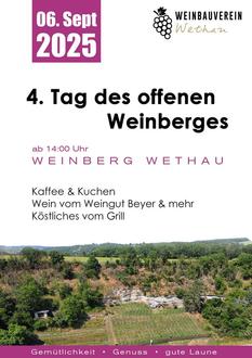 Am 06.09.2025 veranstalten wir ab 14 Uhr unseren „4. Tag des offenen Weinberges“. Hierzu ist jeder herzlich eingeladen, den Weinberg am Langen Berg in Wethau zu besichtigen und einen Nachmittag auf dem Weinberg zu verbringen.