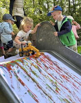Autos und andere Gegenstände wurden durch bunte Farbe gezogen und anschließend die Rutsche hinuntergeschickt. Dabei entstanden prächtige Farbspuren auf großen Papierbahnen. Es war ein Fest für die Sinne und ein Experiment für alle Kinder.