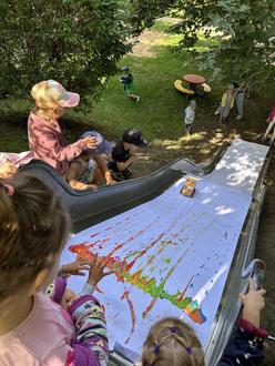 Auf diese Weise haben wir den Kindern gezeigt, dass Kunst überall entstehen kann - auch auf der Rutsche. Sie lernen spielerisch, wie sich Farben mischen, welche Spuren unterschiedliche Gegenstände und Materialien hinterlassen und dass Kreativität keine Grenzen kennt.