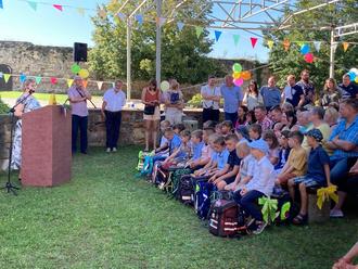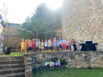 Die Sonne scheint. Die Naturbühne ist schön geschmückt. Überall hängen Luftballons, Wimpelketten und kleine Zuckertüten. Vor der Bühne sitzen 23 aufgeregte und sehr hübsch angezogene Kinder mit Schulranzen. Auf der Bühne stehen die Zweit- und Drittklässler. "Hallo Kinder, jetzt gehts los ..." So werden die ABC-Schützen begrüßt. Die Mädchen und Jungen der zweiten und dritten Klasse führen ihr Programm auf und singen Lieder. Die Tanzgruppe präsentiert ihren Sommertanz - alles unter der Leitung von Frau Wiegand und Frau Eisert.