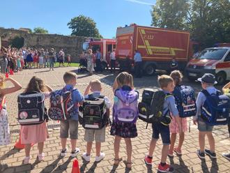 Da die Zuckertüten nicht zu finden sind, ruft die Sekretärin bei der Feuerwehr an. Zum Glück können die Kameradinnen und Kameraden der Feuerwehr Osterfeld die Zuckertüten finden und bringen sie zur Schule. Unterstützt von der Kinder- und Jugendfeuerwehr werden nun alle schön gebastelten und dekorierten Schultüten verteilt. Die Augen der ABC-Schützen werden immer größer und die Freude ist nicht zu übersehen.