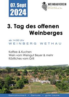 Am 07.09.2024 veranstalten wir ab 14 Uhr unseren „3. Tag des offenen Weinberges“. Hierzu ist jeder herzlich eingeladen, den Weinberg am Langen Berg in Wethau zu besichtigen und einen Nachmittag auf dem Weinberg zu verbringen.