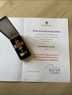 Die Innenministerin Frau Dr. Tamara Zieschang übergab am 09. September 2023 das Brandschutz- und Katastrophenschutz- Ehrenzeichen des Landes Sachsen-Anhalt, in Gardelegen. Für diese Auszeichnung waren aus der Feuerwehr Wethautal die Kameraden Marko Slamka und Jens Dietl vorgesehen. Kamerad Marko Slamka folgte der Einladung und nahm die Auszeichnung entgegen. Kamerad Dietl konnte die Auszeichnung, wegen anderer terminlicher Verpflichtungen, leider nicht persönlich entgegennehmen.