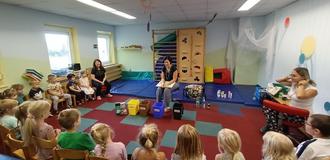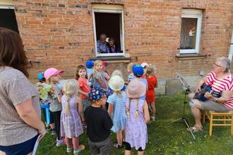 Am 28. August machten wir uns mit dem Feuerwehrbus auf den Weg nach Droitzen. Denn dort feierte Frau Förster ihren 100. Geburtstag. Mit Liedern und einem selbst gebastelten Blumenstrauß (der nicht verwelkt) erfreuten wir die alte Dame und auch ihre anderen Gratulanten. Sie hatte auch eine Überraschung für uns.