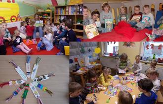 Für die Lesezeit haben wir uns eine gemütliche Kuschelecke eingerichtet, dort lässt es sich vortrefflich zuhören und ins Buch „träumen“. Aber es wird nicht nur gelesen. Wir bewegen uns sportlich zu Geschichten. Wir singen und malen wunderschöne Bilder zu den gehörten Buchinhalten. Die Größeren haben sich sogar ein Lesezeichen gebastelt.