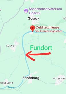 Fundort: östlich der Saale in der Gemarkung Schönburg, am Saaleradweg ca. auf halber Strecke zwischen Oeblitzschleuse und Schönburg, etwas südlich der Bahnquerung