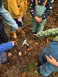 Ein Blick in unser Naturkundebuch und diese Frage war schnell beantwortet. Als Nächstes entdeckten wir das zweite herbstliche Merkmal. Mitten auf der Wiese standen zwei große Pilze. Wir fotografierten den Pilz und schauten in der Kita nach, welchen Pilz wir entdeckt hatten.