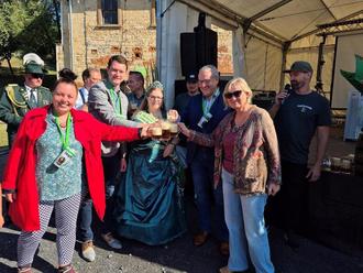 Eisenbergs Bürgermeister Michael Kieslich und der Gemeinschaftsvorsitzende der Verwaltungsgemeinschaft Heideland-Elstertal-Schkölen, Martin Bierbrauer, zum gemeinsamen Fassanstich mit dem Hopfenpapst, der Hopfenkönigin Melanie I. und der Bürgermeisterin von Schkölen, Martina Ehlers-Tomancova, in Schkölen ein.