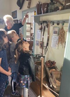 Frau und Herr Seidel erwarteten die Klasse bereits am Rathaus. Frau Seidel ging mit den Kindern ins Heimatmuseum im Rathaus und erklärte all die einzelnen, mit viel Herzblut gestalteten, Räume. Die Kinder standen zunächst in einer alten Küche und staunten über die alten Geräte. Der eine oder andere entdeckte auch etwas aus Omas Küche. Danach ging es durch die gute Stube zum Schulzimmer. Die Kinder probierten Tafel und Griffel aus und bestaunten die alten Fotos der Schule, die Schulkleidung und einzelne Ausstellungspräparate aus alten Zeiten. Im Anschluss durften alle auf dem Dachboden stöbern und entdeckten altes Spielzeug, Kacheln aus Osterfelder Betrieben und allerlei antike Schätze.