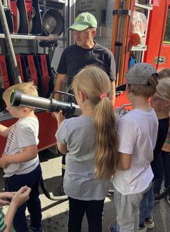 Danach ging es zur Feuerwehr. Herr Teuscher und seine Kameradinnen und Kameraden empfingen die Kinder und zeigten natürlich die großen Fahrzeuge. Viele Schläuche, Spritzen und Werkzeuge wurden aus dem Auto geholt, den Kindern erklärt und teilweise ausprobiert. Natürlich durften auch alle in den Fahrzeugen sitzen und Teile der Ausrüstung "Probe tragen".